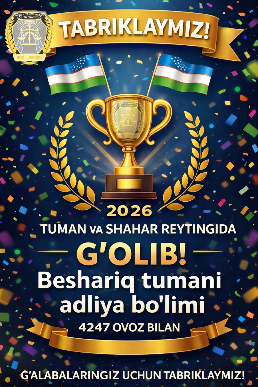"2025-yil davomida eng samarali faoliyat ko'rsatgan adlliya bo'limi (DXM,FHDY,YXKM)" tanlovi yakuniga ko'ra BESHARIQ TUMAN ADLIYA BO'LIMI g'oliblikni qo'lga kiritdi